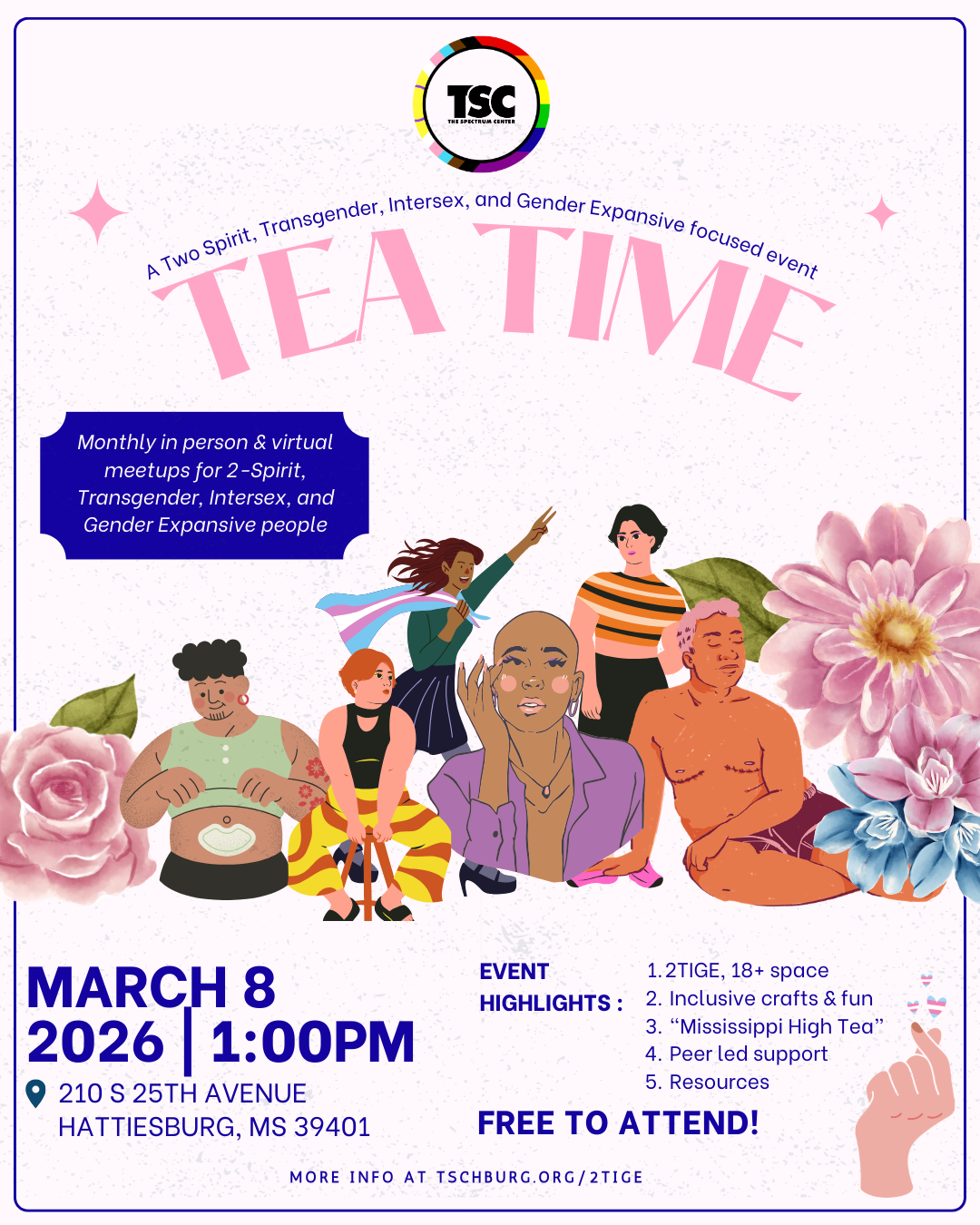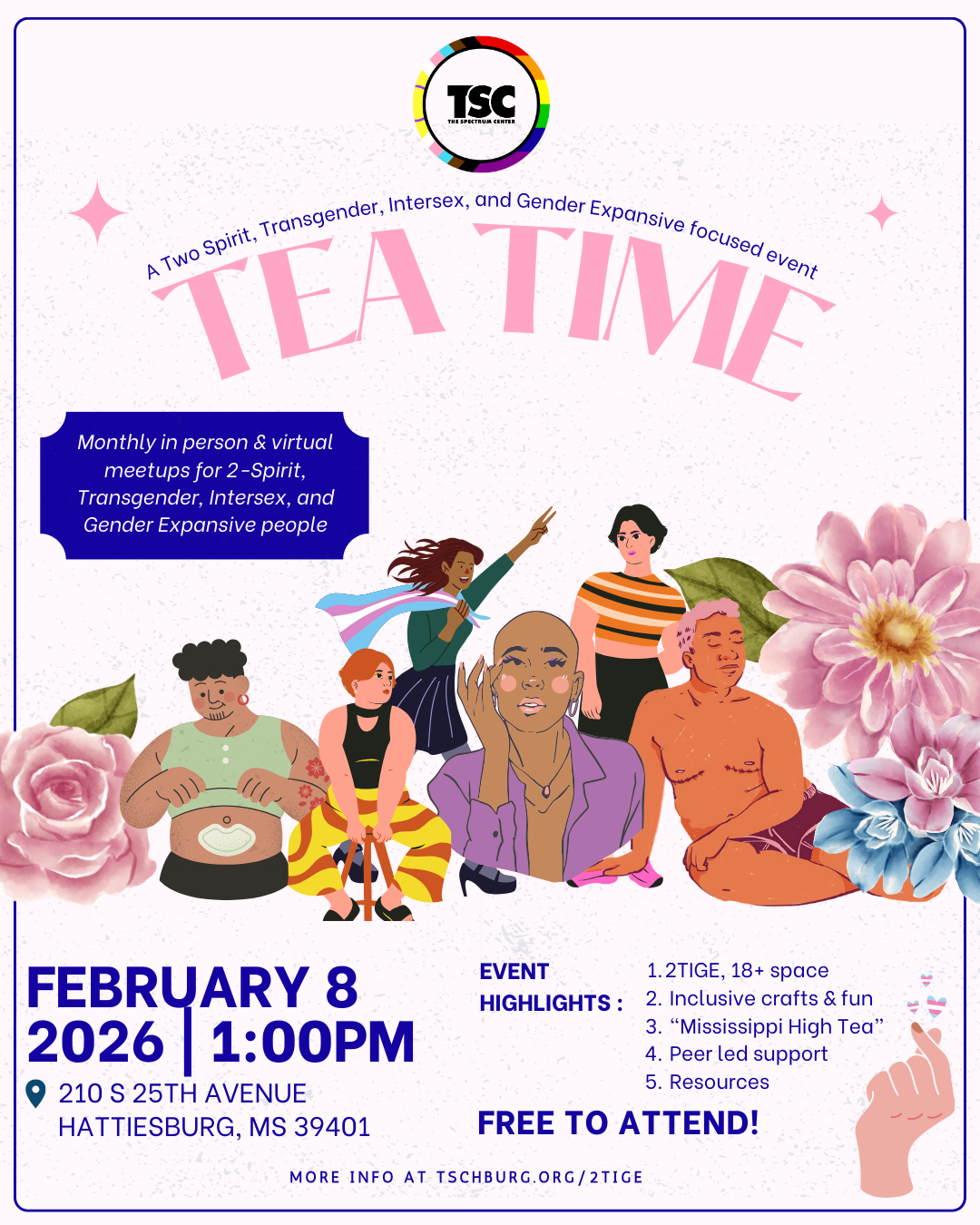 2TIGE programs and events are designed by and for Two Spirit, Transgender, Intersex, and Gender Expansive folks. In addition to a twice-monthly social & support group called Tea Time, TSC also hosts quarterly Name Change Clinics and Clothing Swaps as well as workshops and trainings created with the specific needs of the 2TIGE community in mind. Visit the 2TIGE page for more!