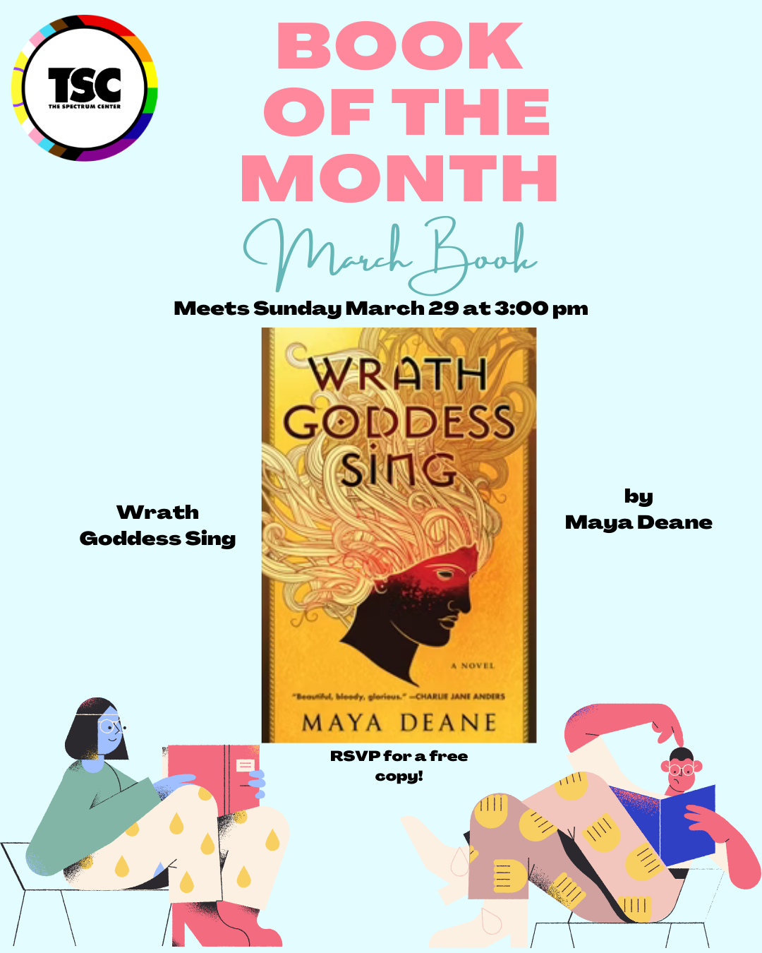 This month's book is Wrath Goddess Sing by Maya Deane! This novel reimagines the Iliad from the perspective of Achilles, a Trans woman who is transformed to match her identity by Athena and drawn into the Trojan war.